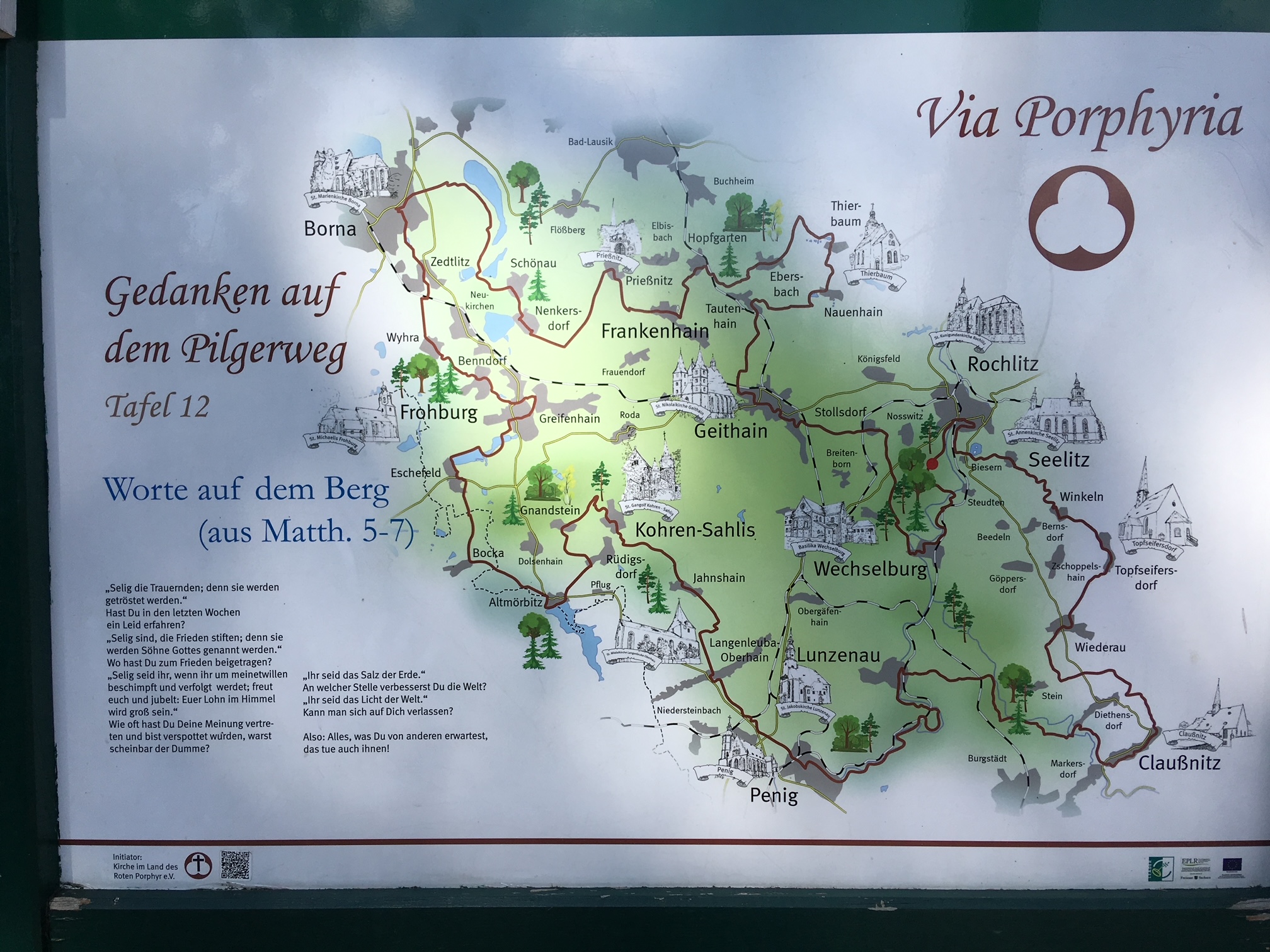 Zu bemerken wäre noch: Die Frau hat ihren eigenen Kopf. Die „Via Porphyria“ ist zwar als Rundweg angelegt, aber ganz der Pilgerwegtradition folgend, nur in einer Laufrichtung beschildert. Rebellisch entschied ich mich dafür, genau entgegengesetzt zu laufen.