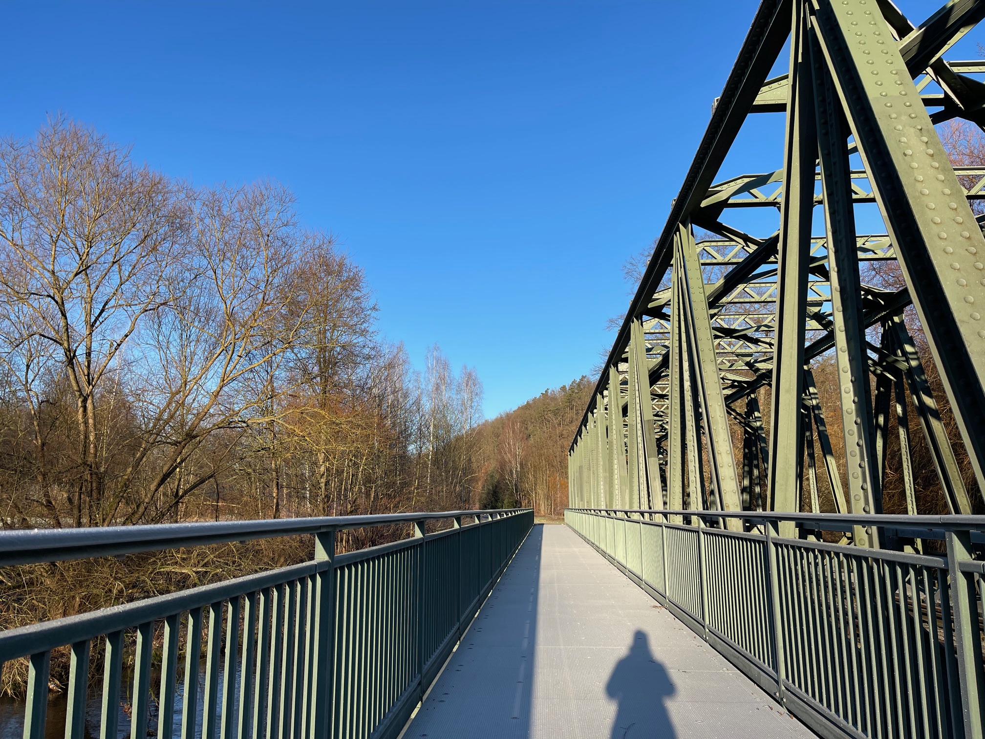 Die schönsten Brücken aber sind die beiden großen Eisenbahnbrücken im Chemnitztal, deren Überquerung den Museumsbahnfahrten vorbehalten ist. Neben beiden wurden eigenständige Fußgängerbrücken für den Radweg errichtet. Ob die Brücken offizielle Namen haben, weiß ich nicht. Bei mir heißen sie: