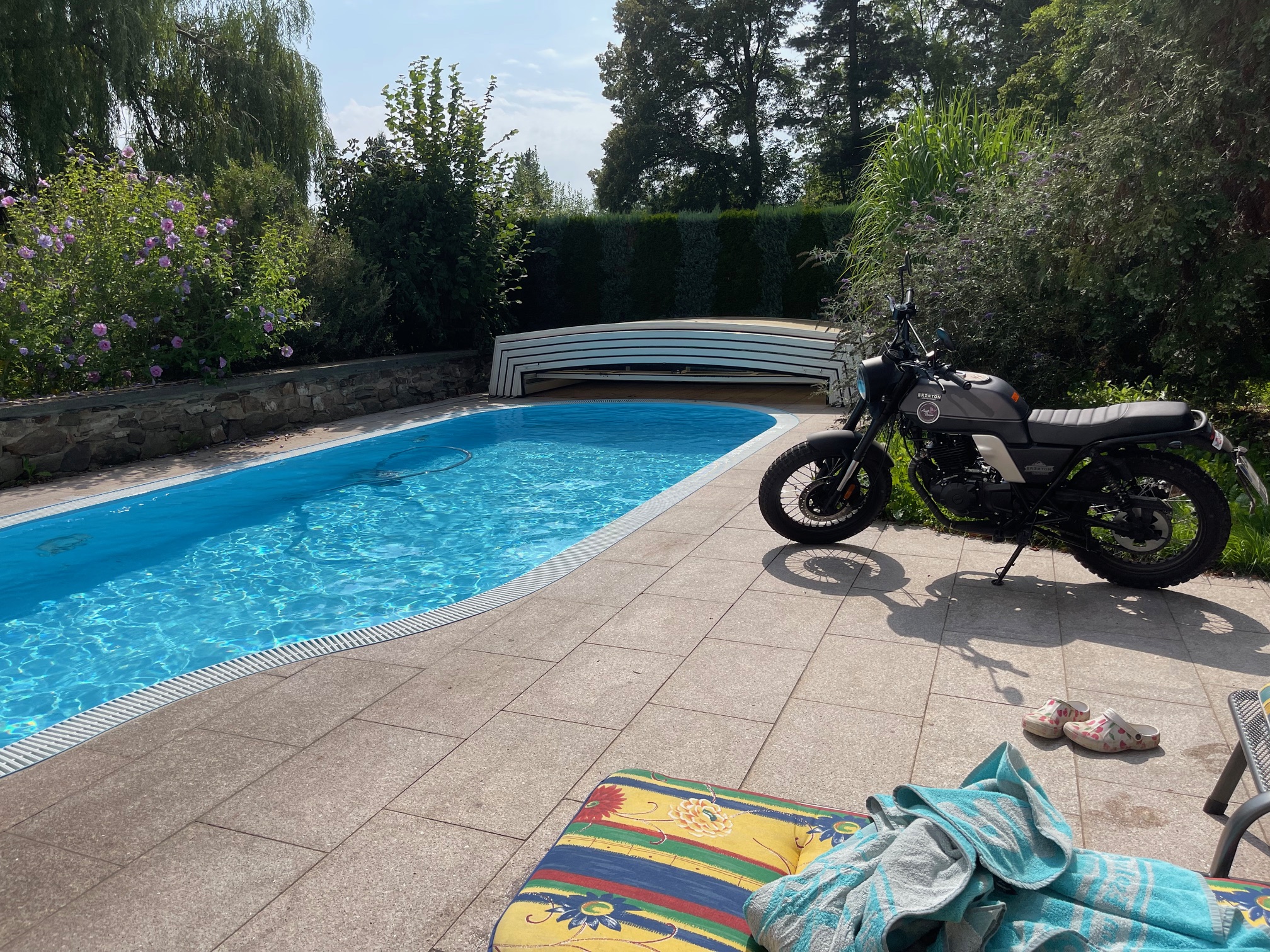 Der Rest läßt sich so ähnlich umschreiben wie die Frage, ob man die Schokolade gesehen hat. Fragt mich also wer nach der Tour, lautet die Antwort: Kurz, sehr kurz. Einmal ums Haus nämlich. Inklusive Kurven (eine Runde auf dem Hof), offroad (hinterm Haus), Füßeruntersetzen(!), Handling-Übung (Wenden von Hand), wahlweise Eis essen oder Kaffee trinken (was der Haushalt eben so hergibt) an ergötzlicher Location und zu später Stunde am Treff (der Gang an den benachbarten Garagen) vorbei über die hervorragend ausgebaute Bergstraße mit Serpentine auf Kopfsteinpflaster zurück auf den Hof. Von allem was dabei, was will man mehr?