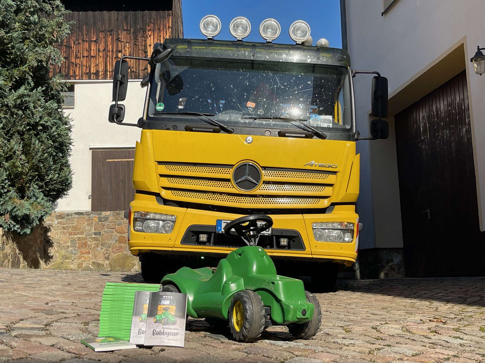 Eines Tages kam er mit der Idee nach Hause, dem kleinen gelben Abschlepper – liebevoll Tweety genannt -, den er fährt, ein Bobbycar aufzu“huckeln“. Weil`s niedlich aussieht. Und sicher nicht nicht nur Kinderaugen zum Strahlen bringt.